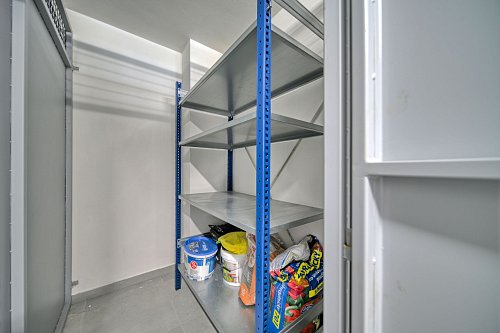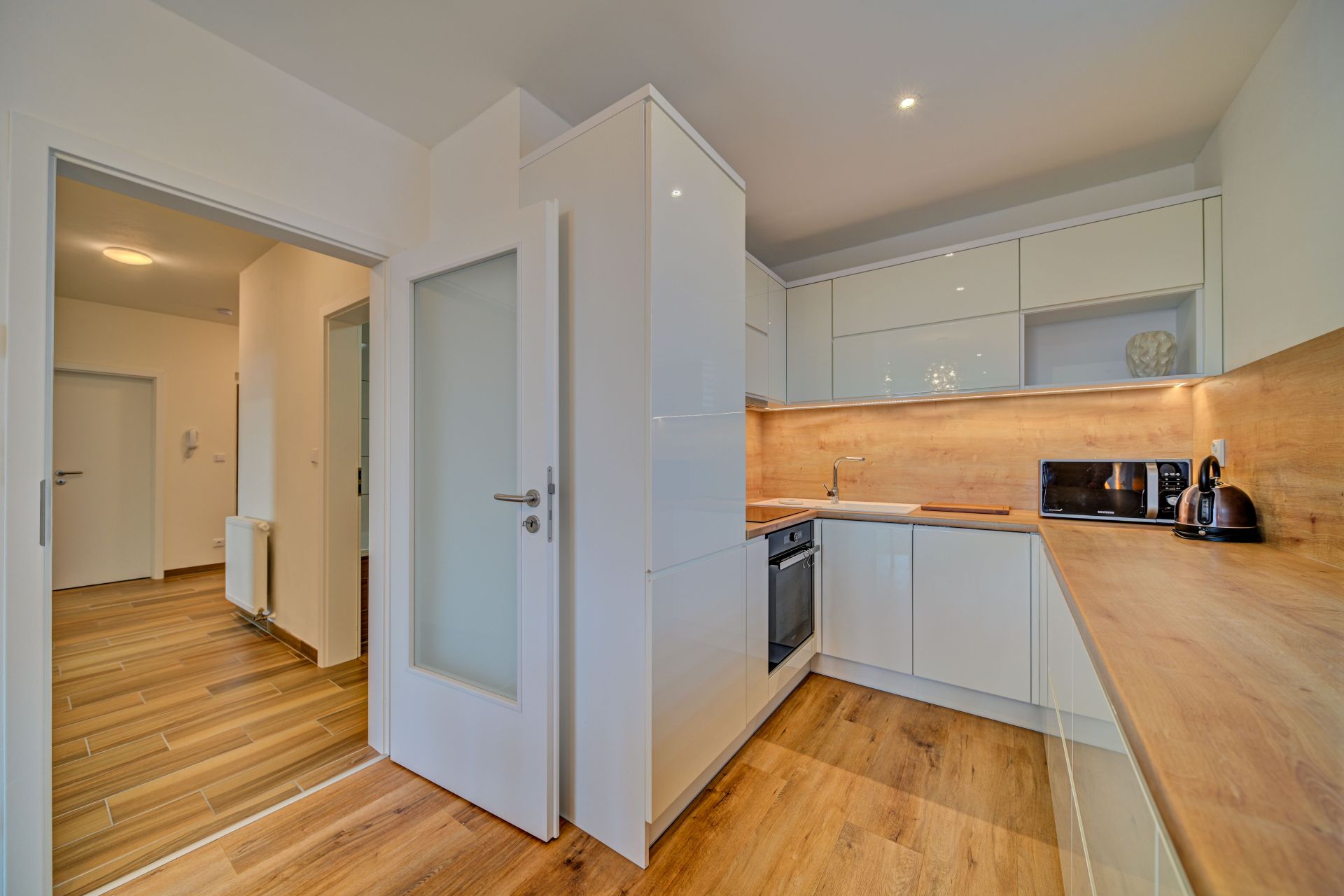 Dominantou bytu je světlý obývací pokoj s kuchyňským koutem o velikosti 21,48 m², kde je pro maximální tepelný komfort instalována termoizolace v podhledech, která přispívá k příjemnému klimatu po celý rok. Kuchyň je vybavena kvalitní kuchyňskou linkou s vestavěnými spotřebiči a drtičkou bioodpadu, což podtrhuje praktický a moderní charakter bydlení. Celý byt je vybaven předokenními žaluziemi, které zajišťují vysoký komfort bydlení, účinnou regulaci světla i teploty a zároveň dostatek soukromí.