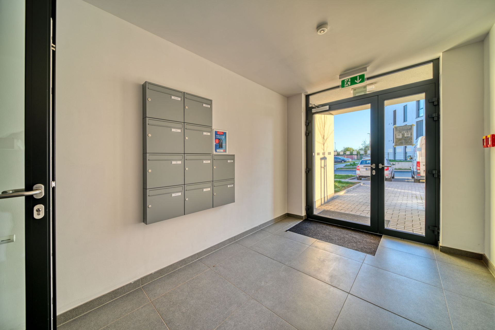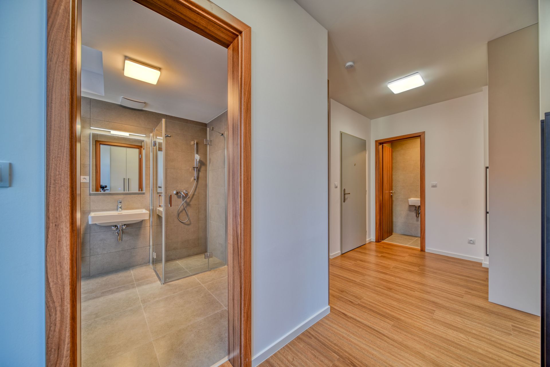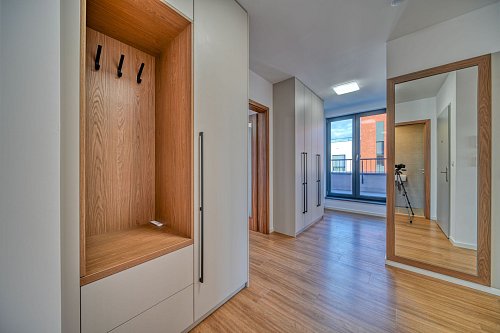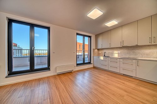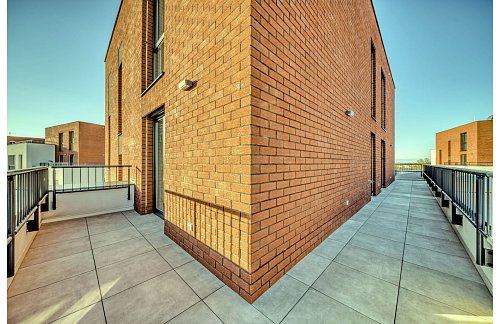 Velkou předností bytu je prostorná terasa o rozloze 42,4 m², ideální pro relaxaci či posezení s přáteli. K bytu dále náleží sklepní kóje a venkovní parkovací stání. V domě je k dispozici výtah i kolárna. Interiér bytu je řešen v moderním stylu – součástí je rohová kuchyňská linka s vestavěnými spotřebiči (varná deska, trouba, mikrovlnná trouba, lednice, myčka, digestoř). V chodbě se nachází vestavěné skříně, které nabízejí dostatek úložného prostoru. Koupelna je vybavena sprchovým koutem, toaleta je samostatná s umyvadlem.