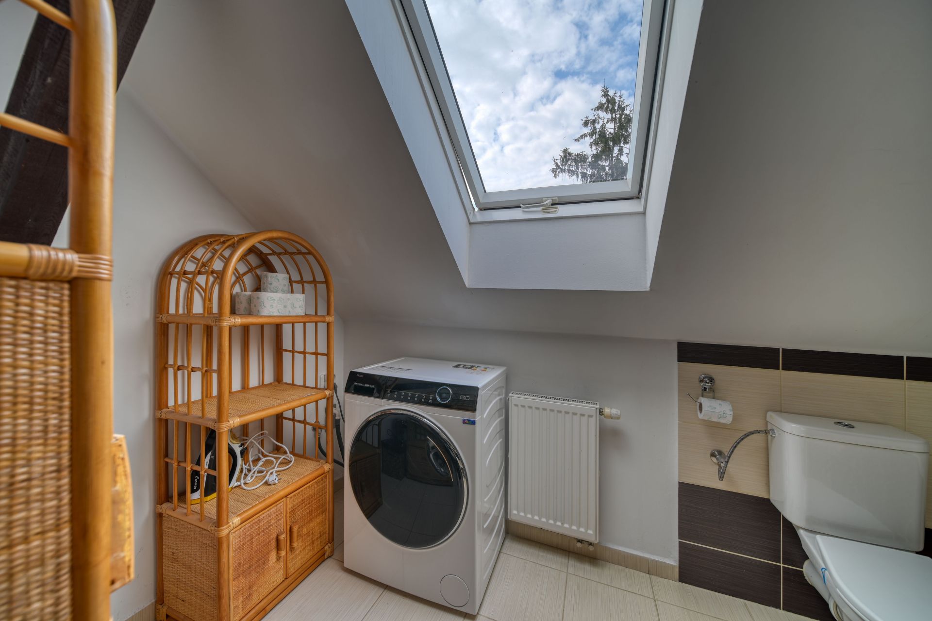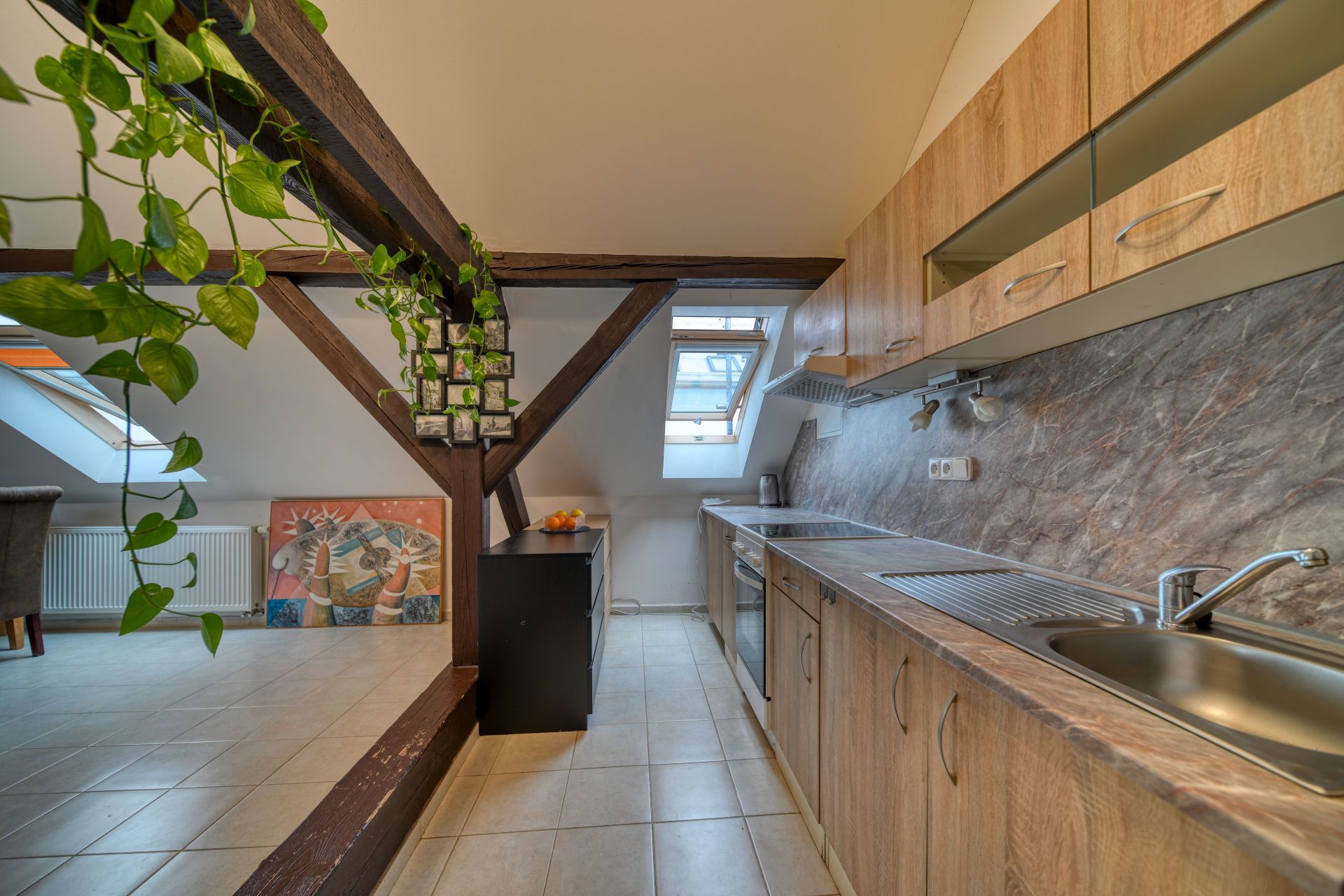 Světlý podkrovní prostor nabízí dostatek místa pro pohodlné bydlení a je ideální pro jednotlivce nebo pár. Praktická kuchyňská linka je již součástí bytu a je vybavena elektrickým sporákem a digestoří, což usnadní okamžité nastěhování a přípravu Vašich oblíbených pokrmů.